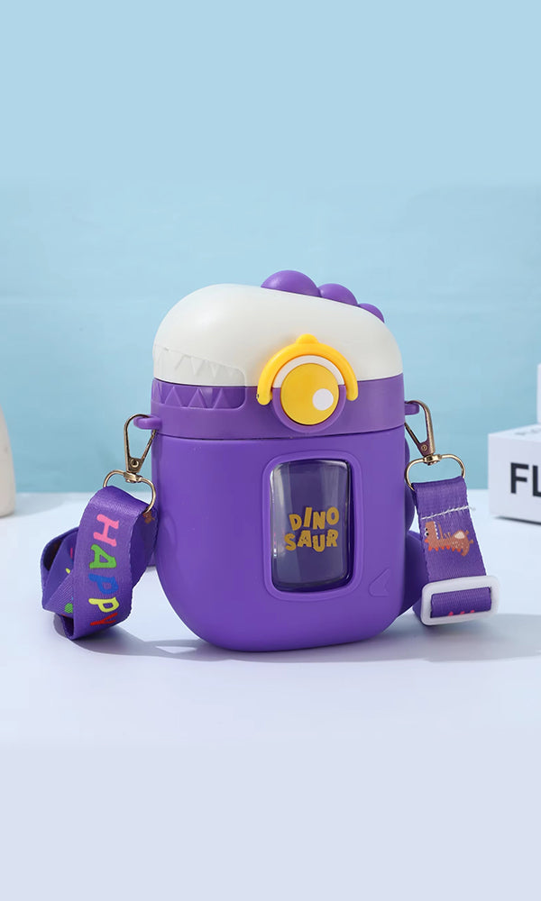 Strap: It comes with a detachable, adjustable strap printed with colorful graphics like cartoon plants, fun symbols, and the word “TIME.” The strap complements the bottle with hues that match the purple theme.