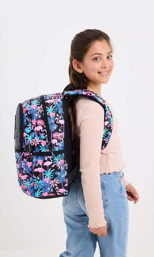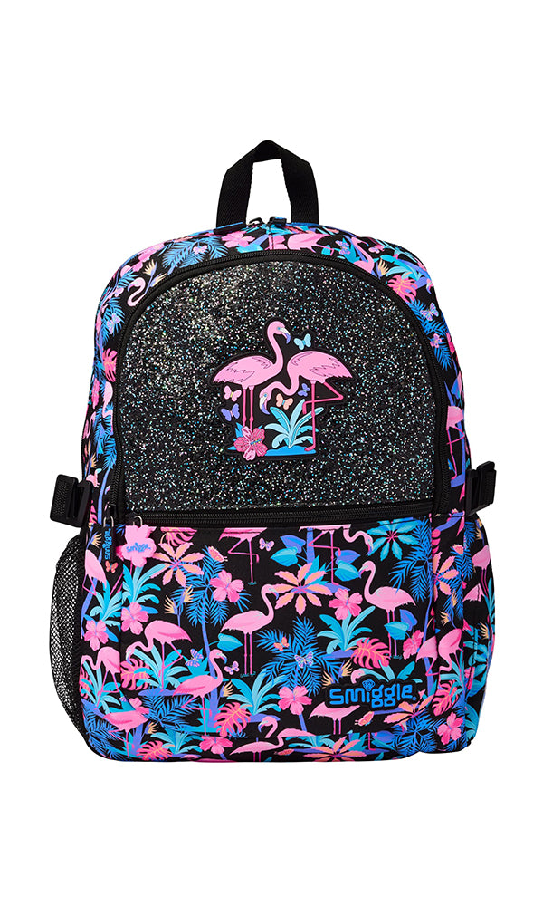 Turn heads at school or on the go with this vibrant Smiggle Tropical Flamingo Backpack. Designed in a striking black base adorned with neon pink flamingos and lush tropical leaves, this bag combines fun and function effortlessly. The upper front panel sparkles with glitter and features a bold flamingo graphic, adding a touch of glam. With spacious compartments, side mesh pockets, and adjustable straps, it's perfect for carrying school supplies, snacks, and more. Whether for everyday use or special outings, this eye-catching backpack brings a splash of summer fun to every adventure.
