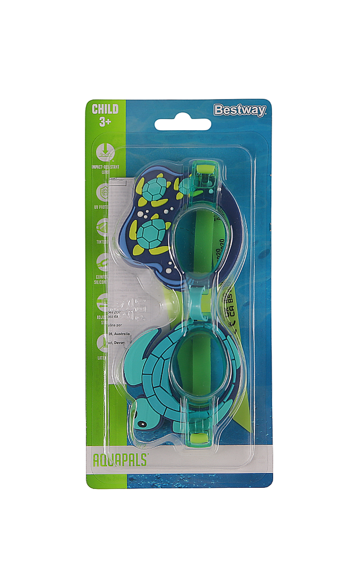 Give your child a colorful friend to take with them on all their underwater adventures with the Bestway Aqua Pals goggles. Perfect for kids aged 3 and up, kids can wear their favorite sea creature as they swim and splash in the pool or ocean. UV & SHOCK RESISTANT LENS - Give your child a view through another shade with fun tinted, impact-resistant lenses. Protect your child's eyes from harmful UV rays thanks to the special UV protection coating on each lens of the glasses. Rest assured that their little eyes won't squint no matter how long they choose to play all day Comfortable fit: Bestway Aqua Pals goggles are made of latex-free material, allowing your child to keep their goggles on for endless hours of swimming. An adjustable nose bridge and silicone head strap allow you to adjust your glasses so they can enjoy a soft yet secure fit for plenty of uninterrupted play.