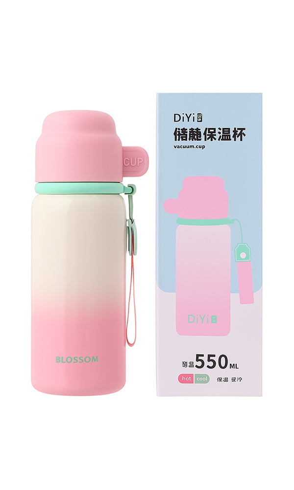 Packaging: The box design features pastel pink highlights and clean branding, with product details like DiYi, 550 ml capacity, and vacuum cup in both English and Chinese.